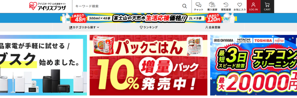 アイリスプラザは、日用品から家電まで幅広く取り扱う通販サイトで、特にコスパの良さに定評があります。自社製品を中心に展開しているため、中間コストが抑えられ、他サイトと比較しても価格が安いのが特徴です。